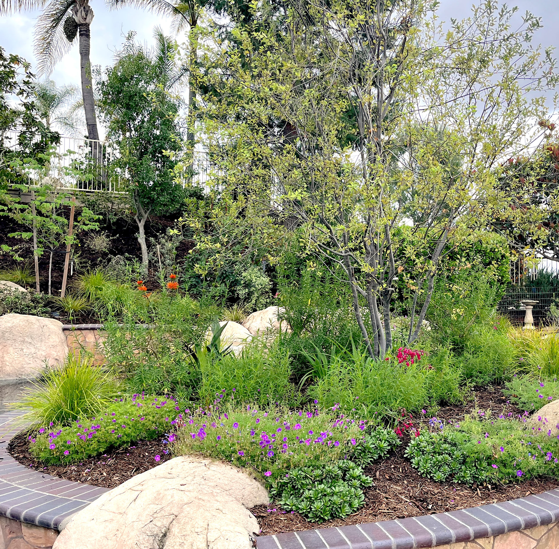 The large property was overgrown with mature volunteer trees and unmaintained shrubs crowding out sunlight. The owners main request was to have more habitat friendly plants and colorful low growing vegetation near the pool area. As well to have side yard screening from the neighboring property construction next door. The screening walkway nicknamed the Woodland Walk was planted with various maple trees, maple vines, and native heuchera.