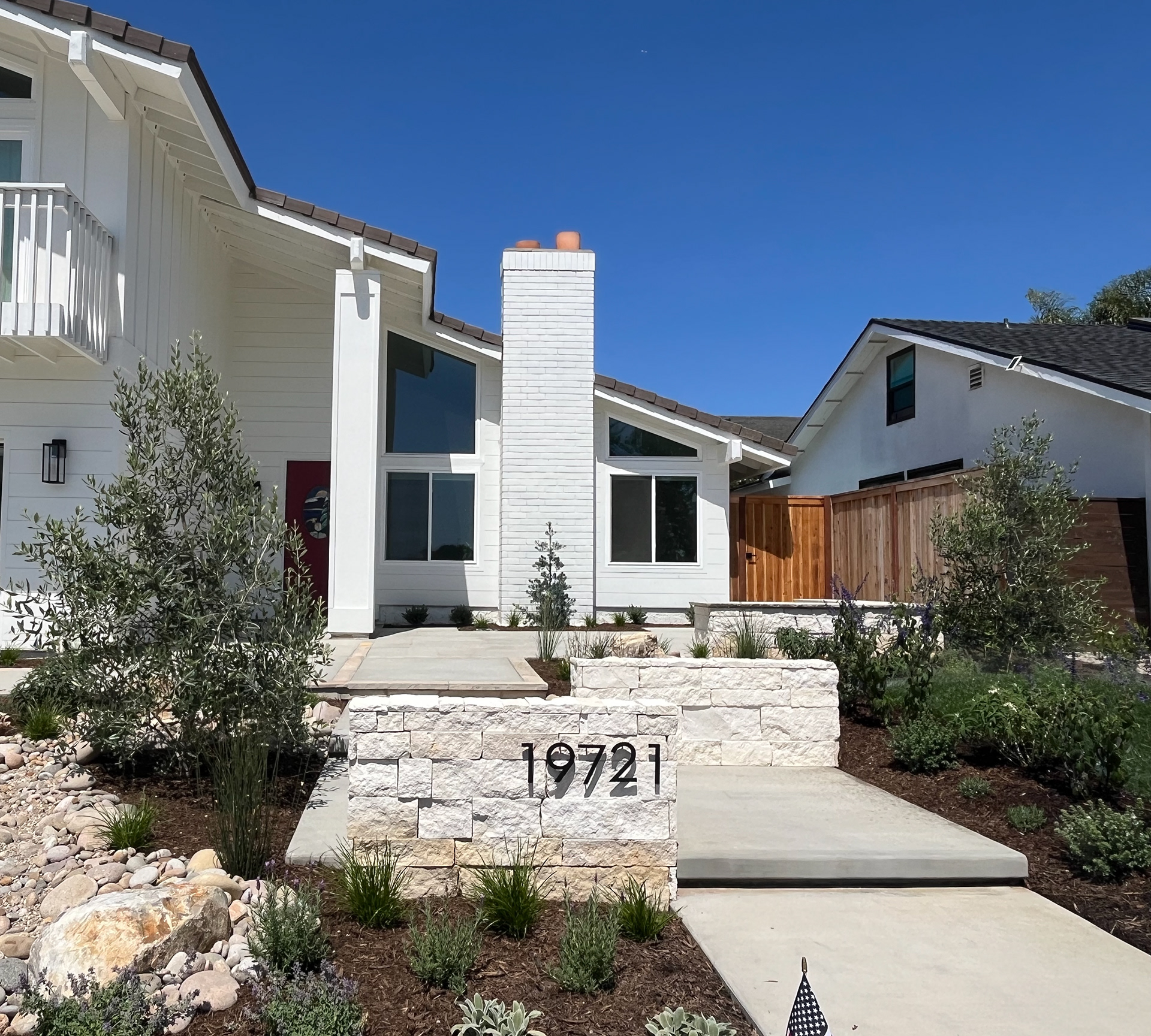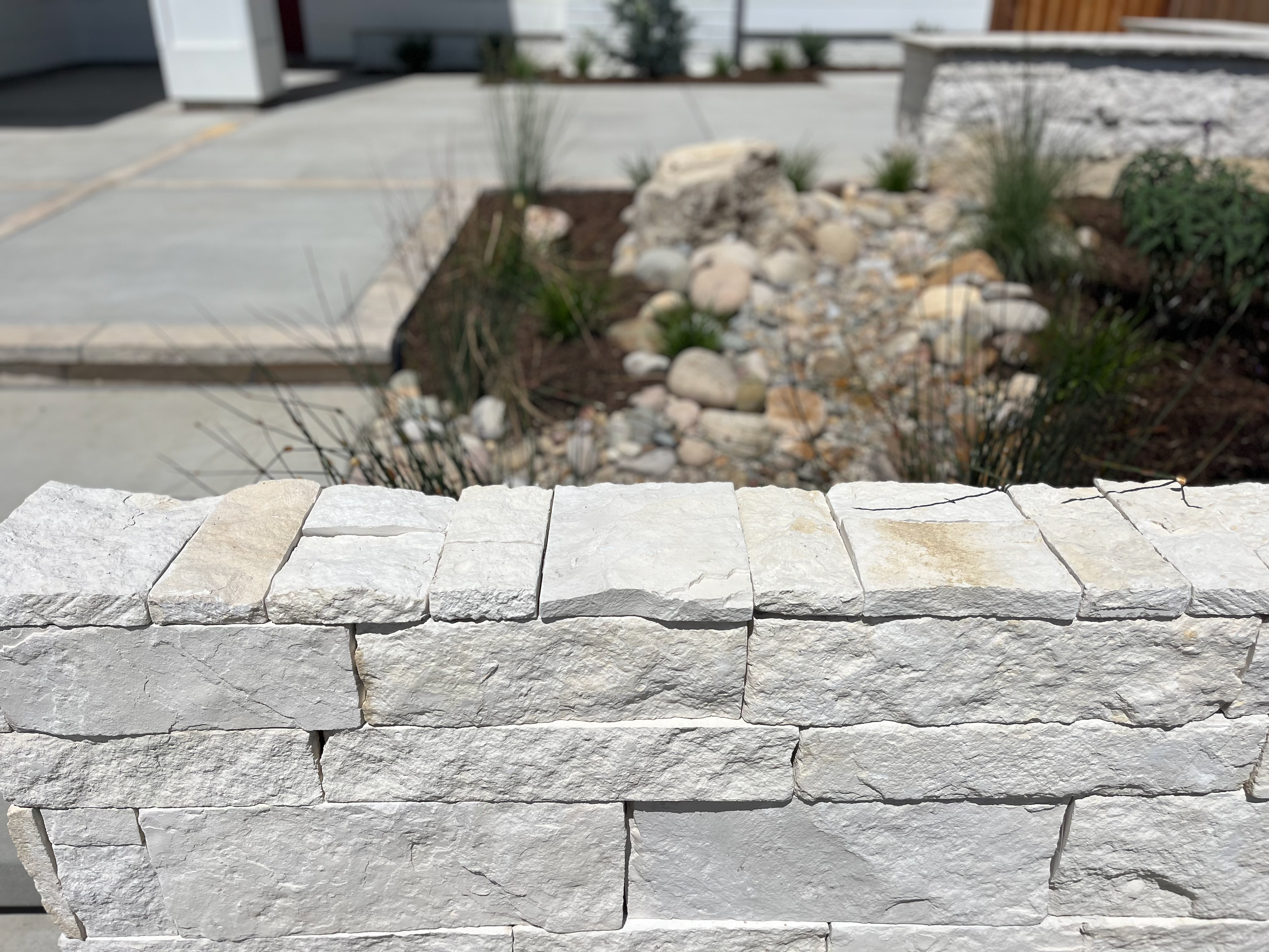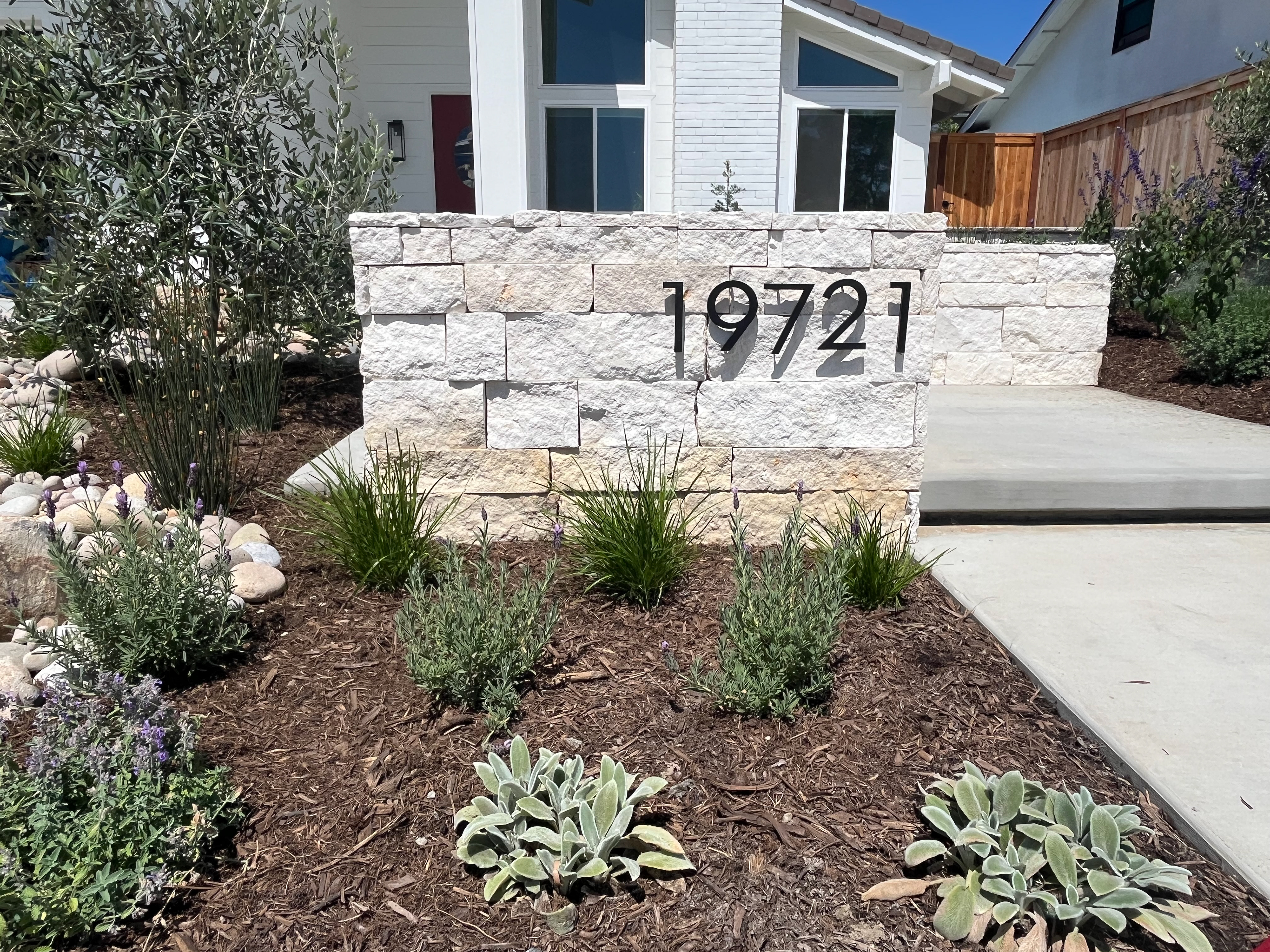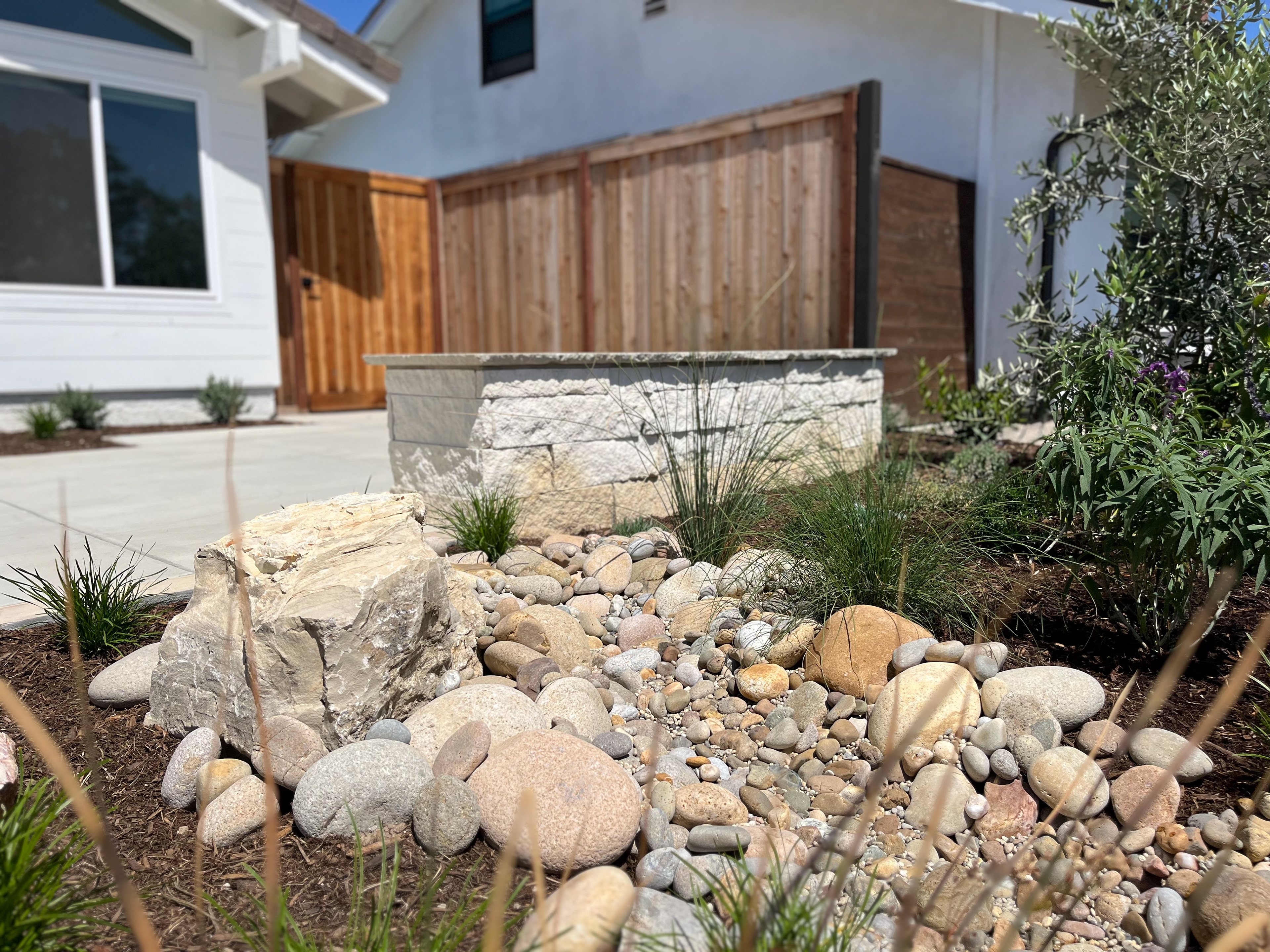 The clients newly constructed house front entrance was left in concrete rubble. Starting from scratch, the site levels gave an opportunity to match the asymmetrical roof house with a sense of structural balance by adding a series of low concrete walls. Reverse ascending asymmetrical cantilevered block steps leading to the entrance patio giving a sense of privacy. To offset the newly constructed modern house materials, a natural soft stone palette was chosen to finish the series of walls, seat walls and flagstone border to soften the concrete patios. The water feature dry rock swale crosses under the concrete block walkway to capture runoff from the driveway side, ending at the low point in front of the address wall. Plant palette was a mix of showy regional and native plants along with a small bermed lawn for the young children to roll down.