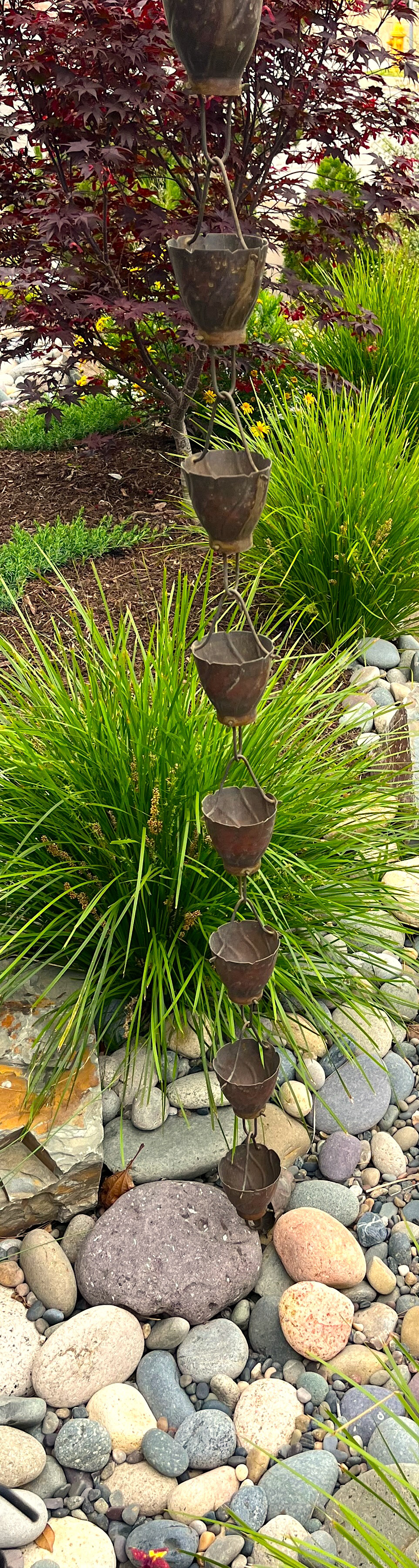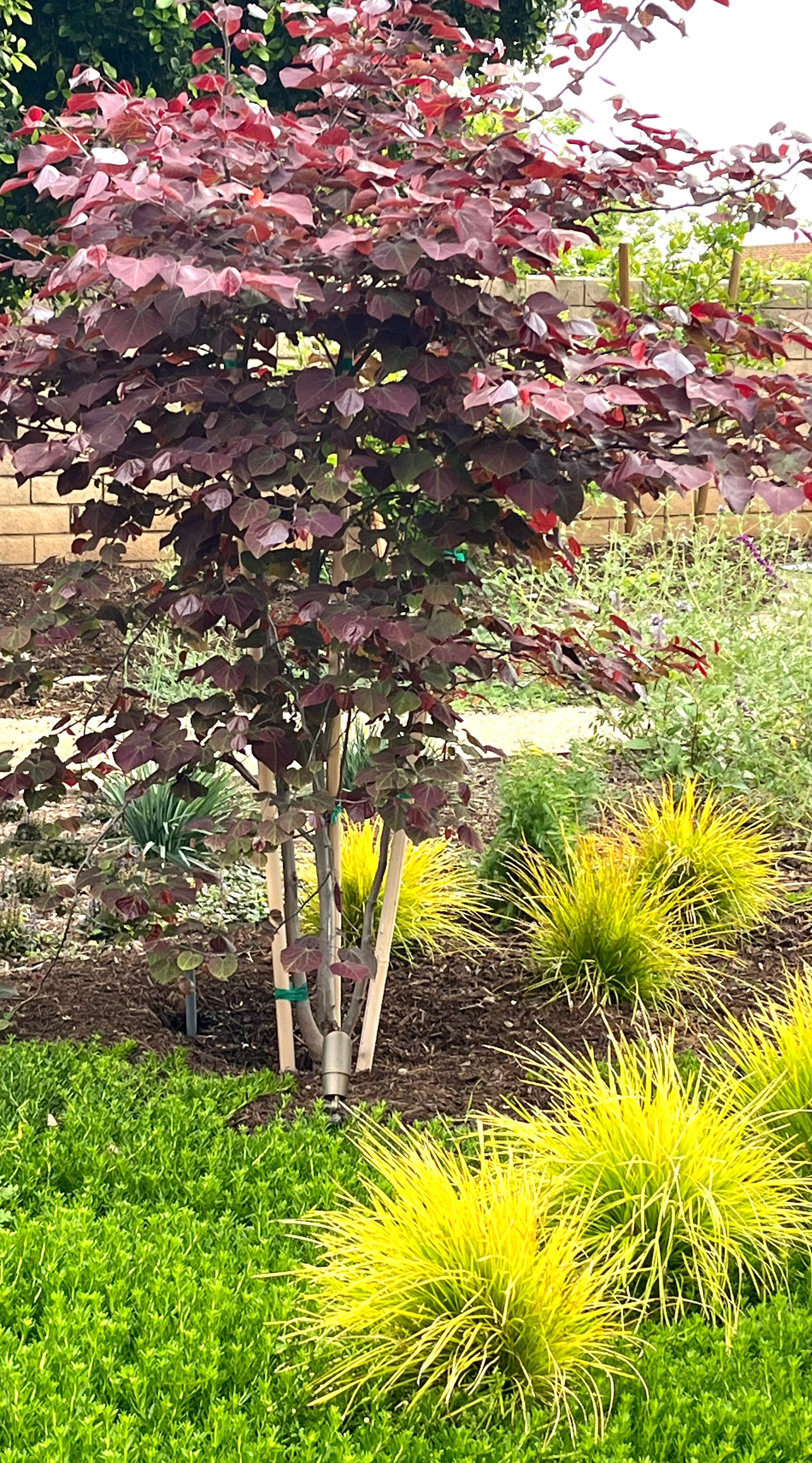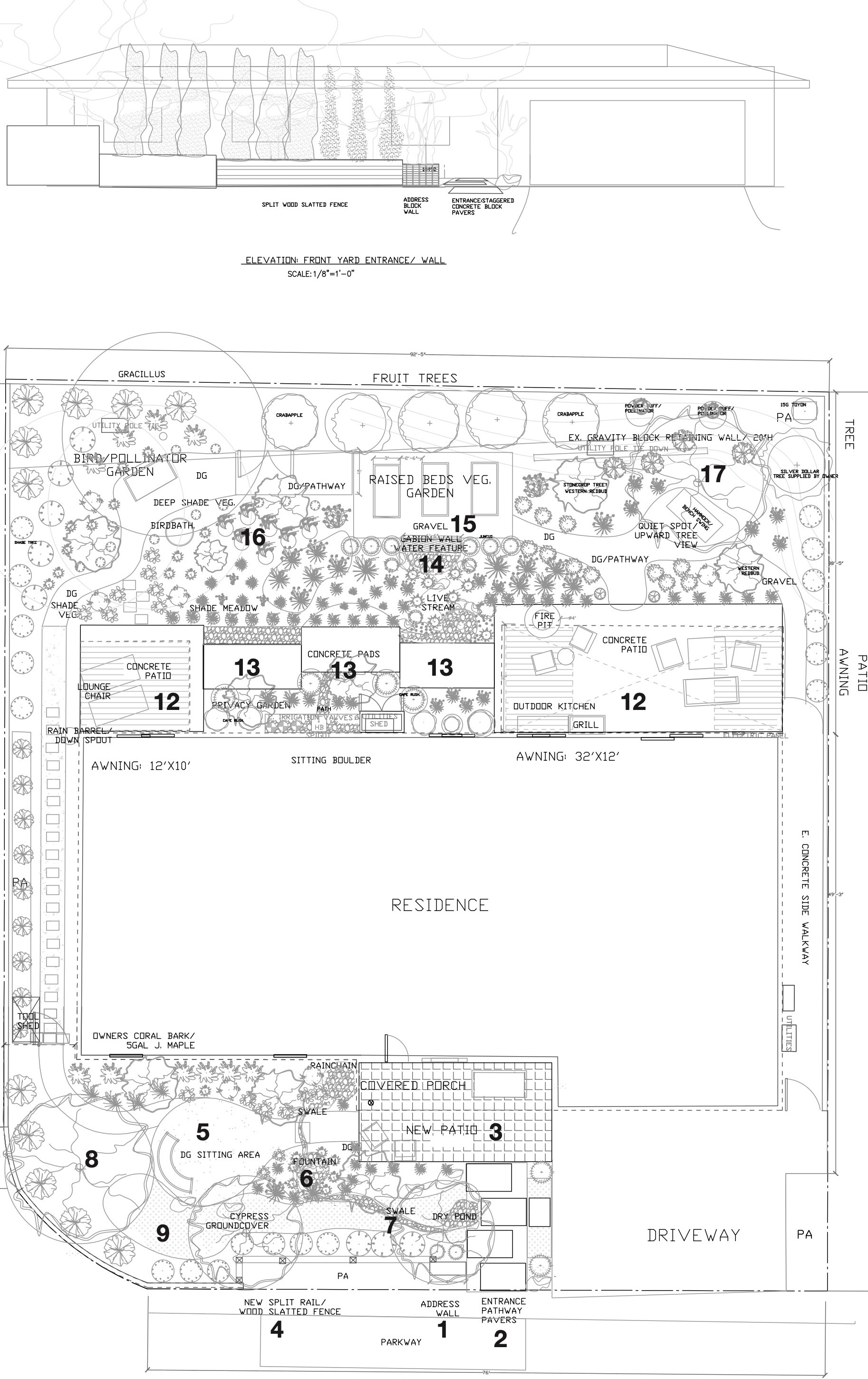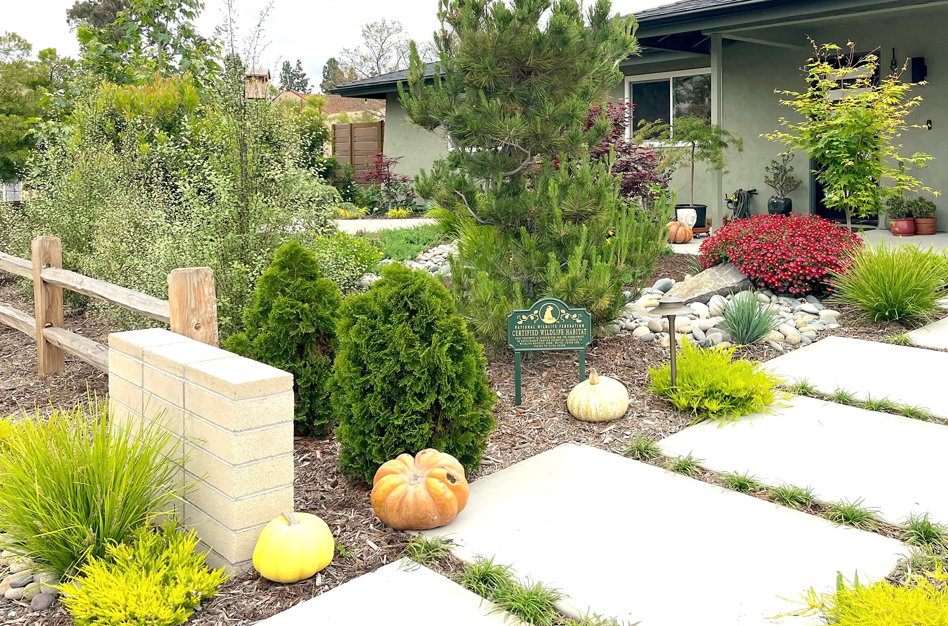 A young couples first home looking to blend their modern lifestyle into a natural setting to observe pollinators and wildlife habitat from backyard seating areas on a congested corner lot. Mature screening shrubs and California Sycamore trees were brought in to add privacy and give a sense of space off of the busy street. Japanese maples surrounded by low growing cypress, and native grasses surrounded the dry creek swale running through the front yard. The rear yard allowed for large asymmetrical concrete block formed walkways to a large outdoor living porch. Low rolling berms planted with native salvias, regional blooms, seeded with native wildflower mix, lead to a low-lying CA native meadow surrounded by redbud trees emptying into a large boulder fountain. The plant palette was carefully select to supply habitat with food and shelter, as the owners view comfortably from the new shade covered outdoor living porch.