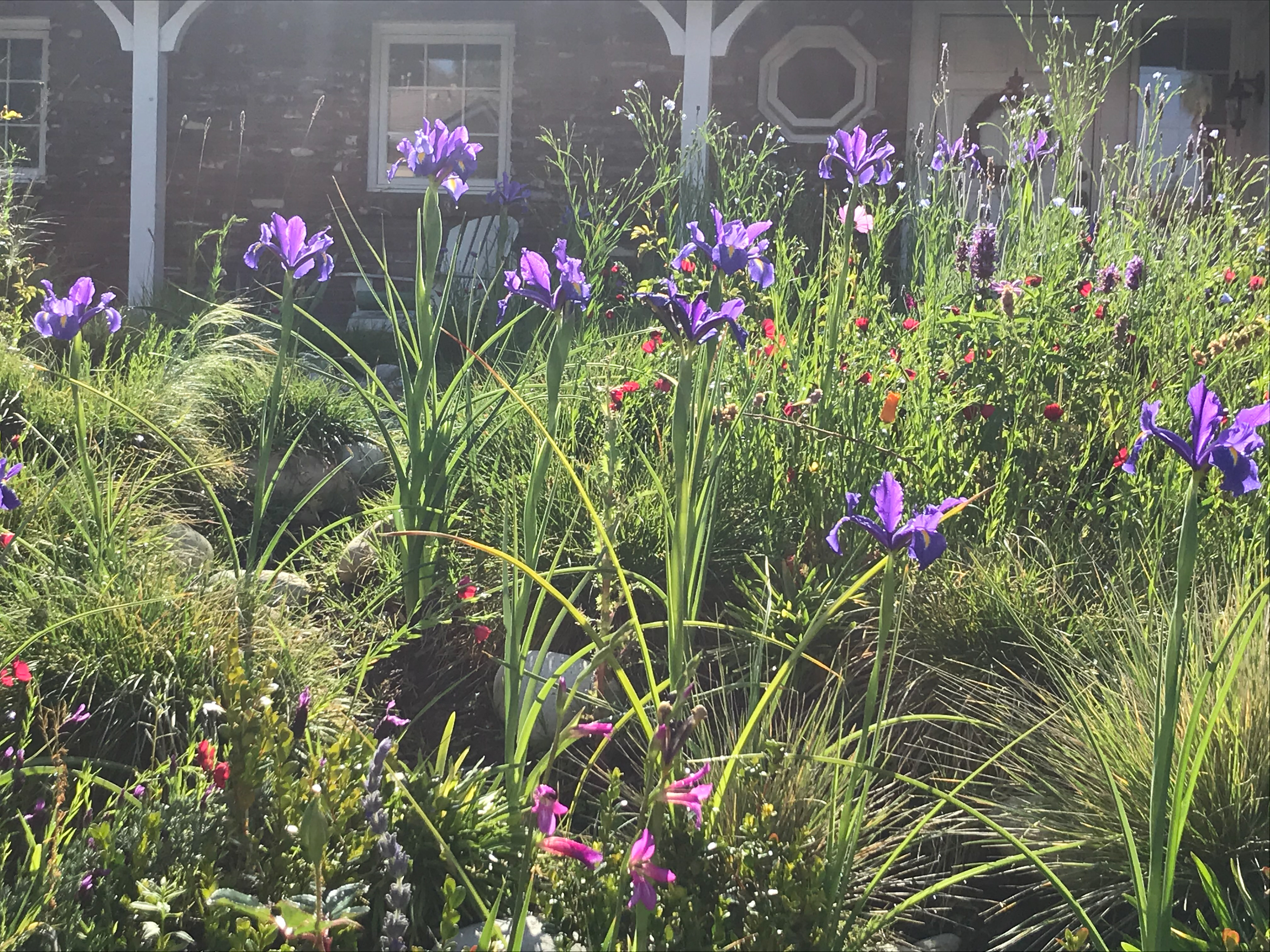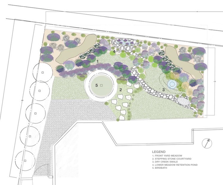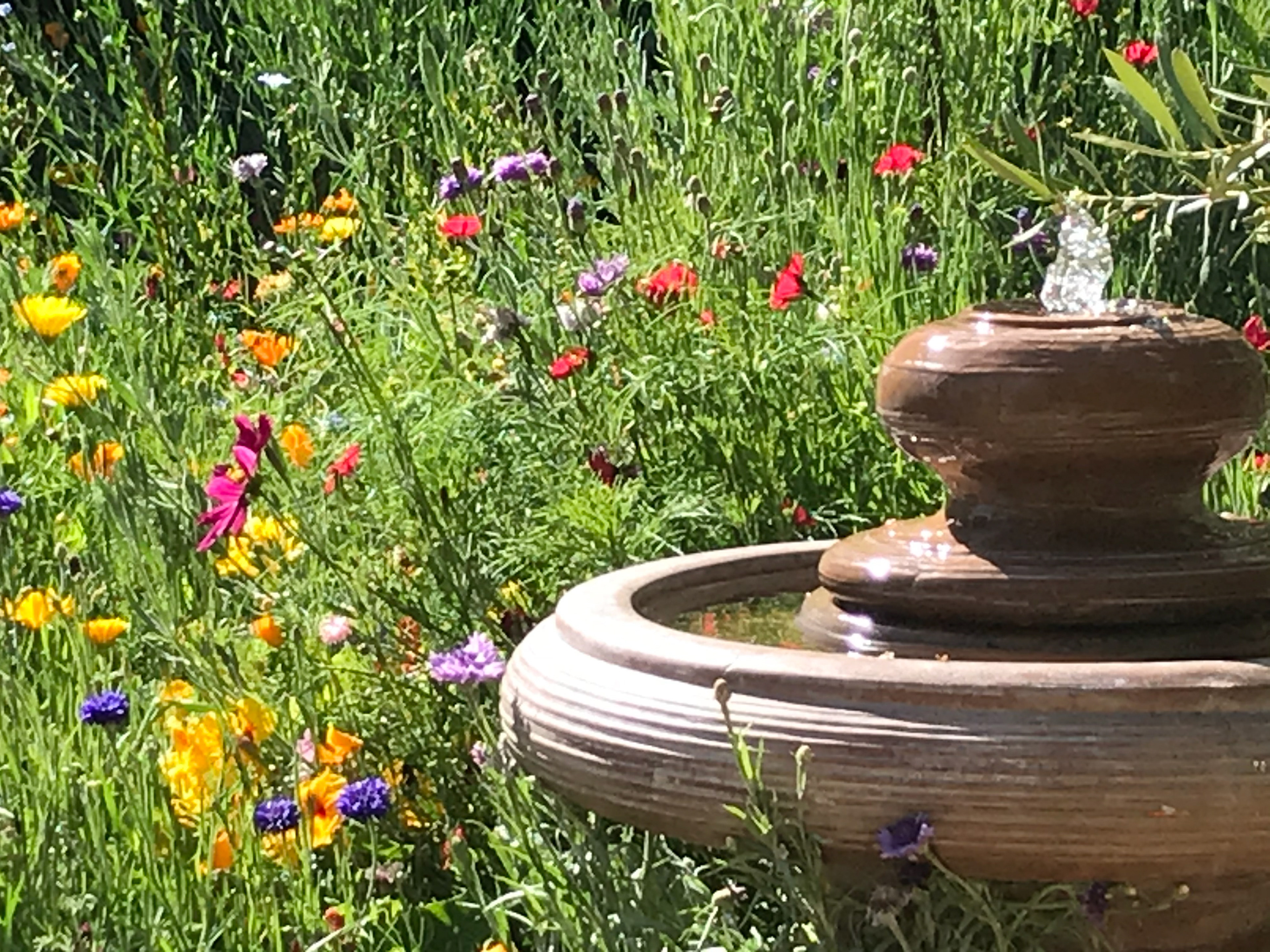 What began as a simple lawn replacement project, became an environmental ecosystem setting to connect humans to wildlife and nature's surroundings. Nellie Gail Ranch, filled with open space trails for horseback riding and plenty of wildlife habitat, the owners requested to increase the natural surroundings and wildlife experience to the front yard. Mature California Sycamore trees were brought in, to be surrounded by native grasses and a dry creek bed running through the center of the hillside property landscape. A California meadow was planted with native salvias, regional blooms and seeded with native wildflower mix to add seasonal interest for Spring. The finishing touch was the solar birdbath to attract native birds in the neighborhood.