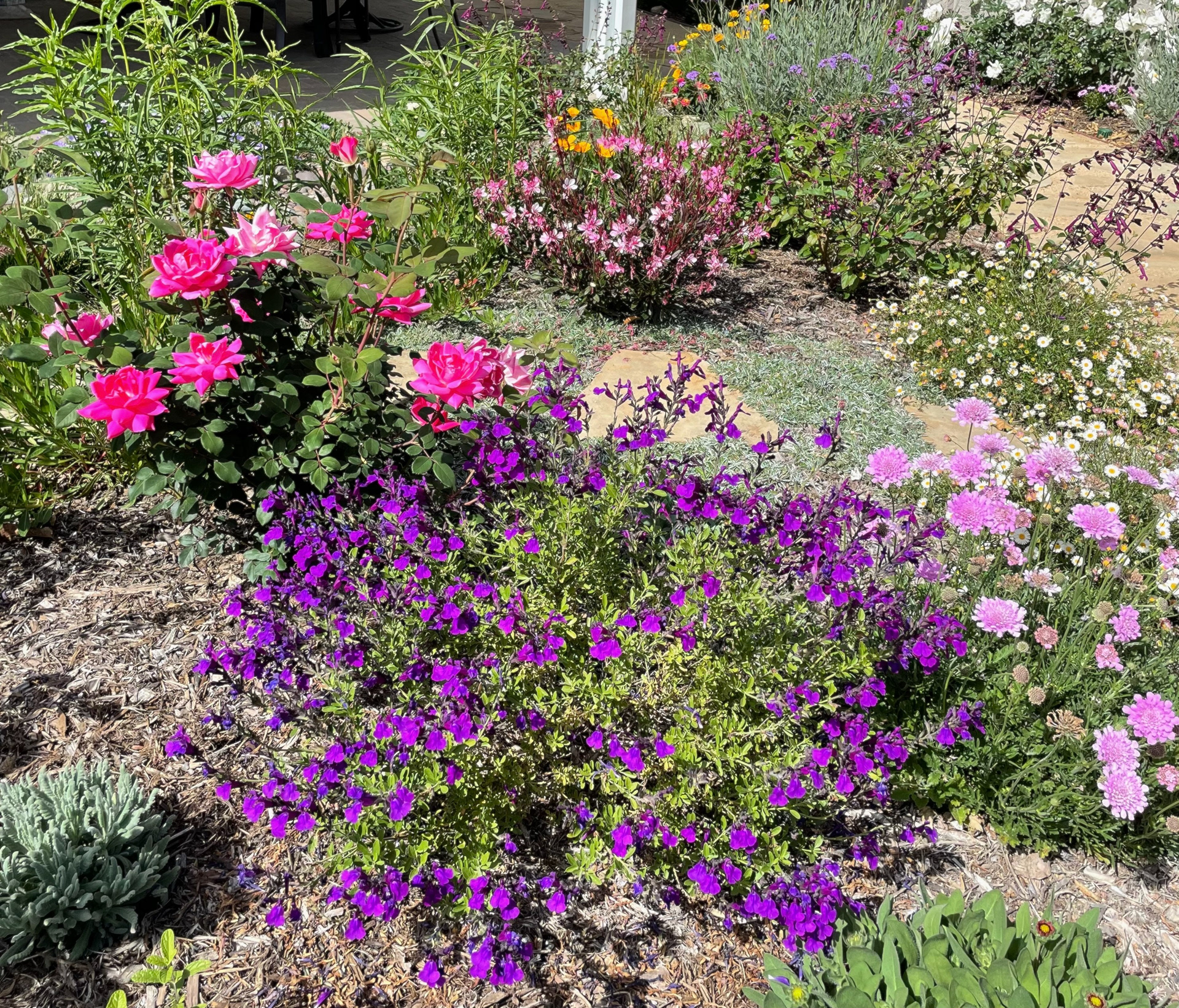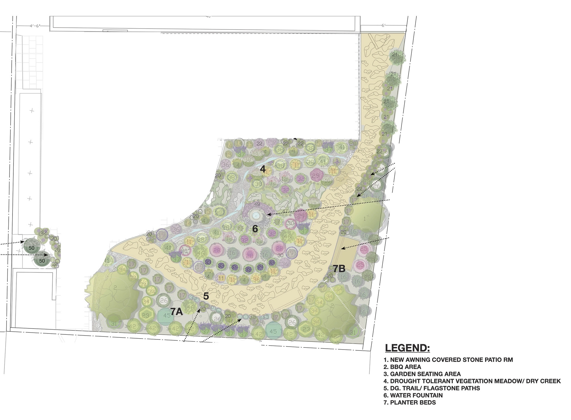Backyard lawn removal to connect the limited sq. footage area to take advantage of the Open Space view. The connection to nature's sight and sounds blend seamlessly from the newly renovated backyard patio. By incorporating a winding swale and native plant meadow, attracting the neighboring Open Space habitat.