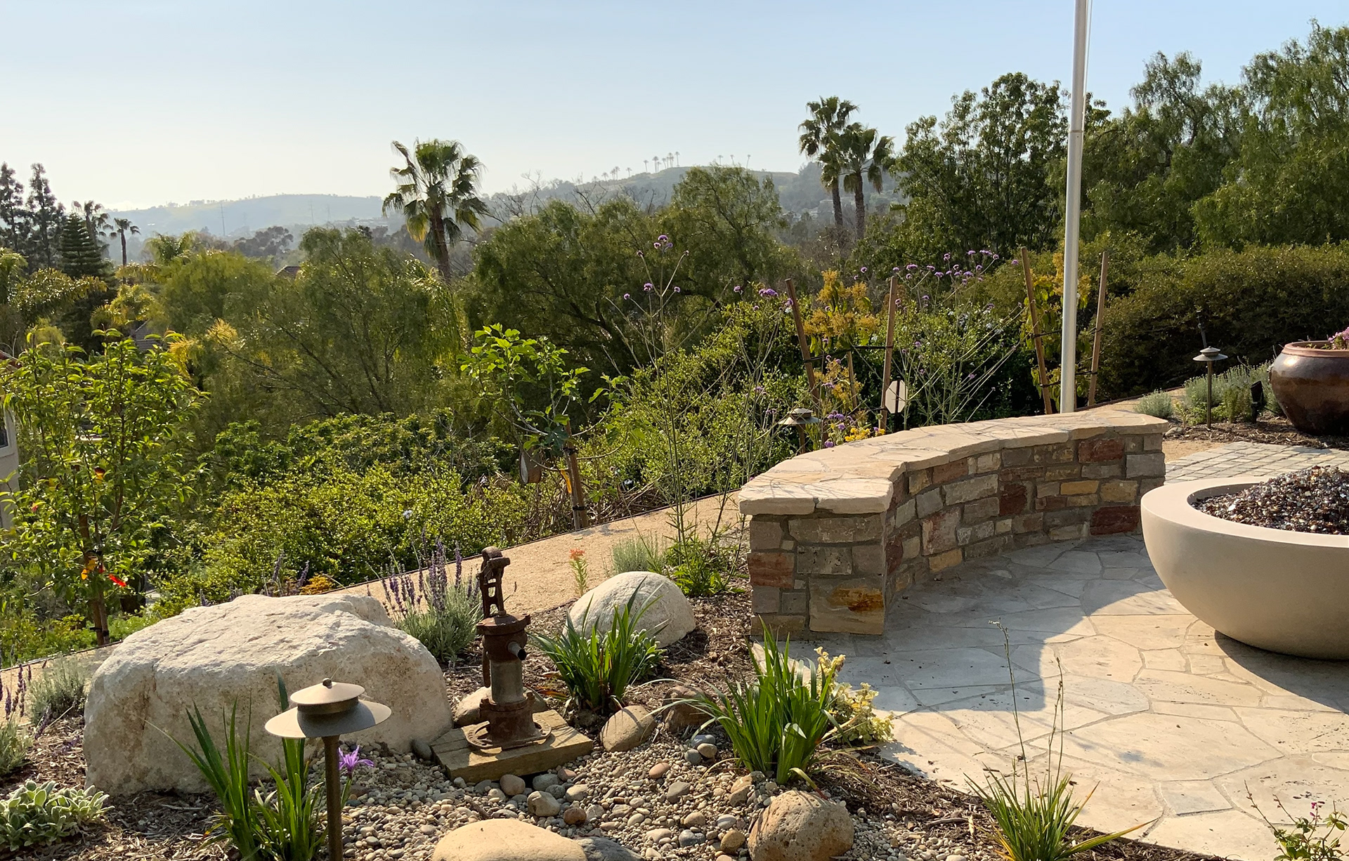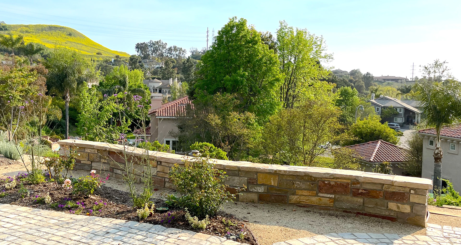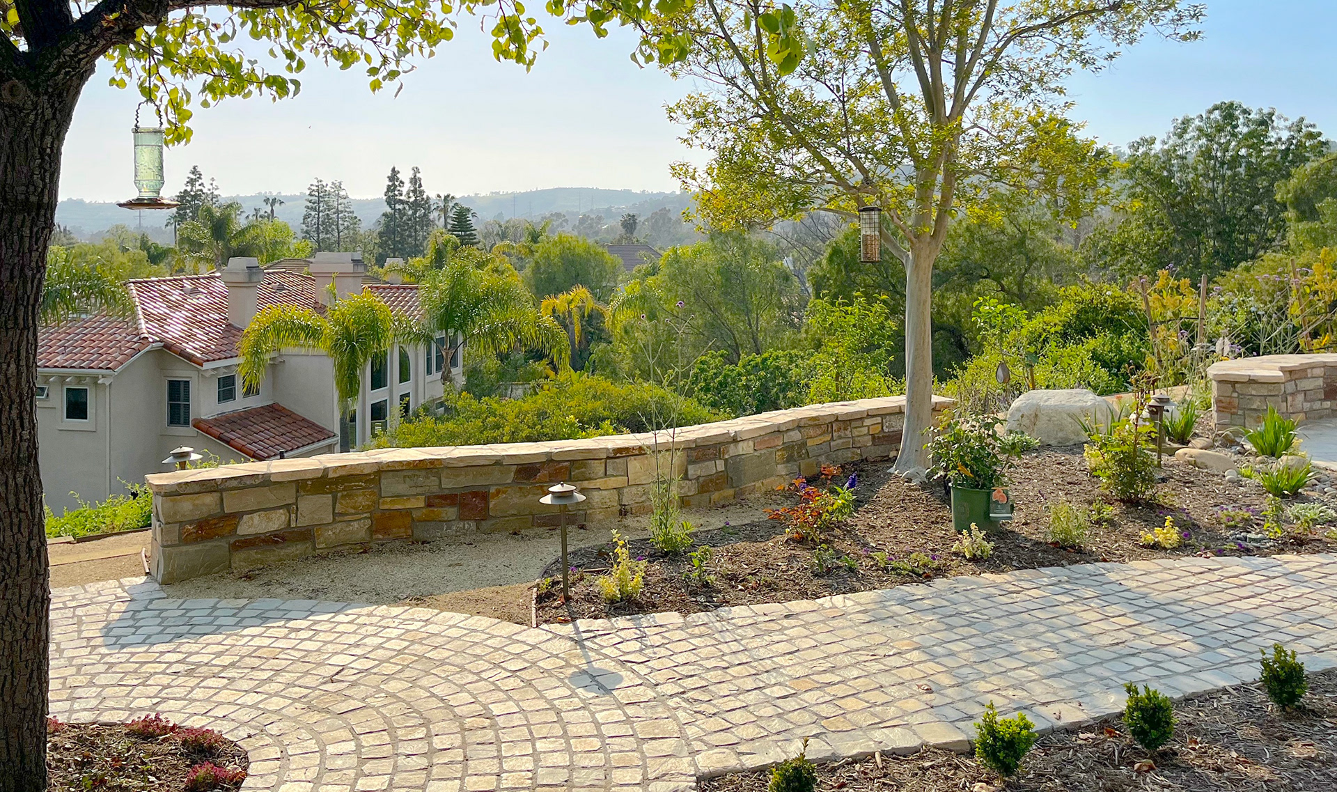 The terraced gardens transformed a sloped area into a series of layered tiered garden levels and seating areas. The upper stone cobble walkways through the cutting garden, lead to the outdoor entertaining and firepit area. The curved stone walls double as a seat wall and an unobtrusive low property barrier to the slope side. At the top of the slope landscape, timbered steps leading to the soft DG pathways through a newly planted young orchard, lined with fruit trees that terrace the length of the property.