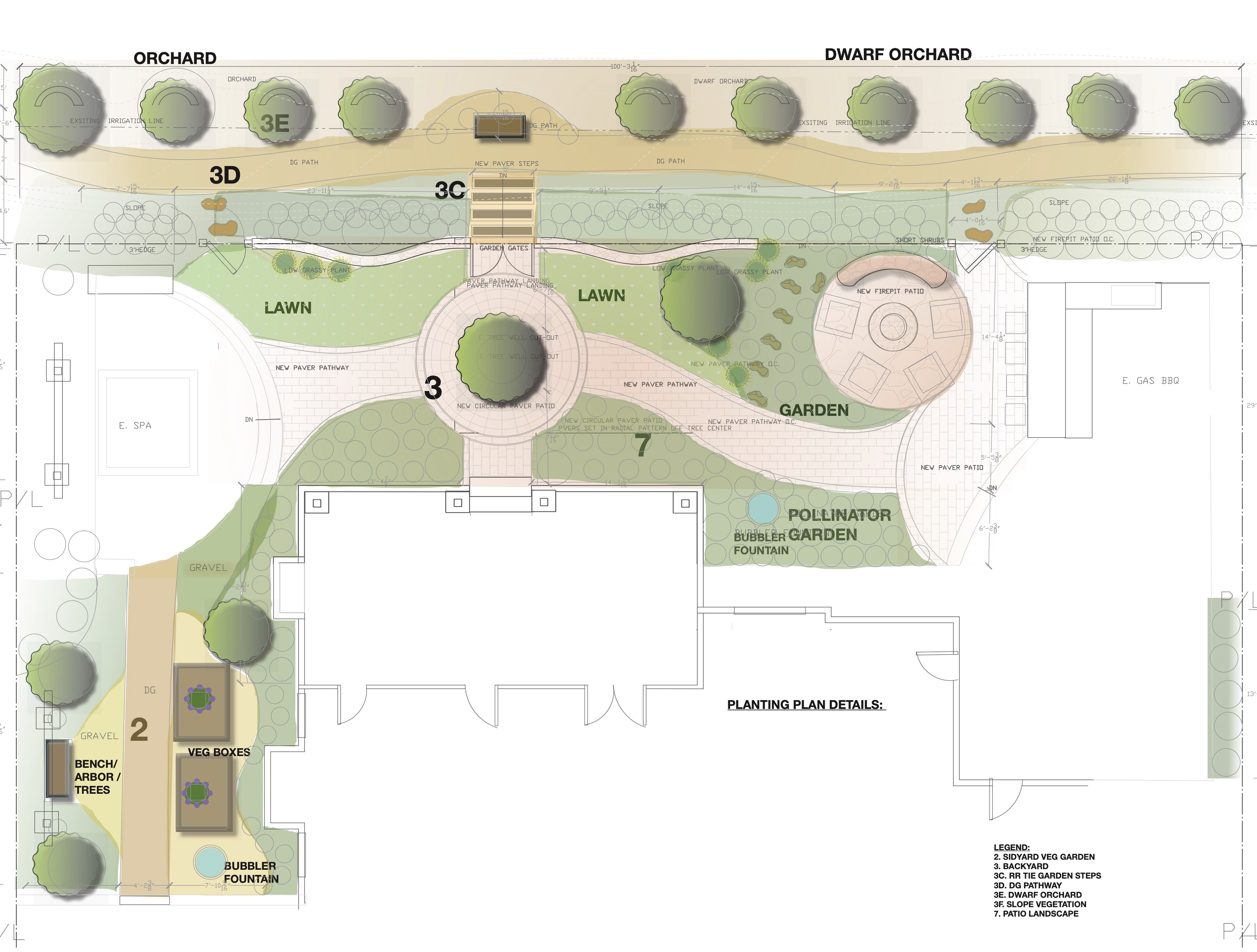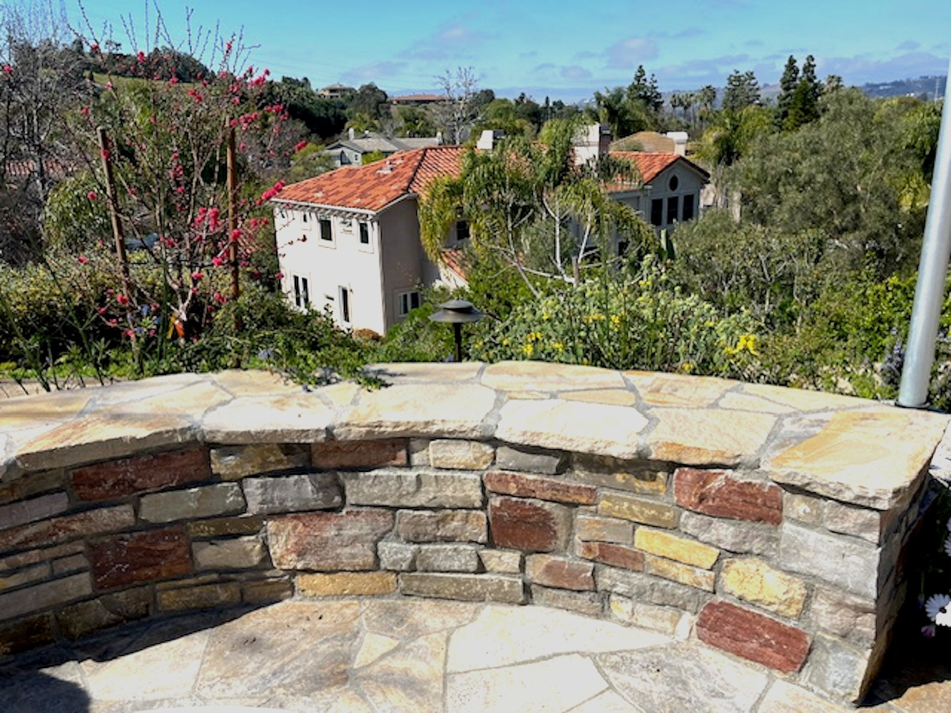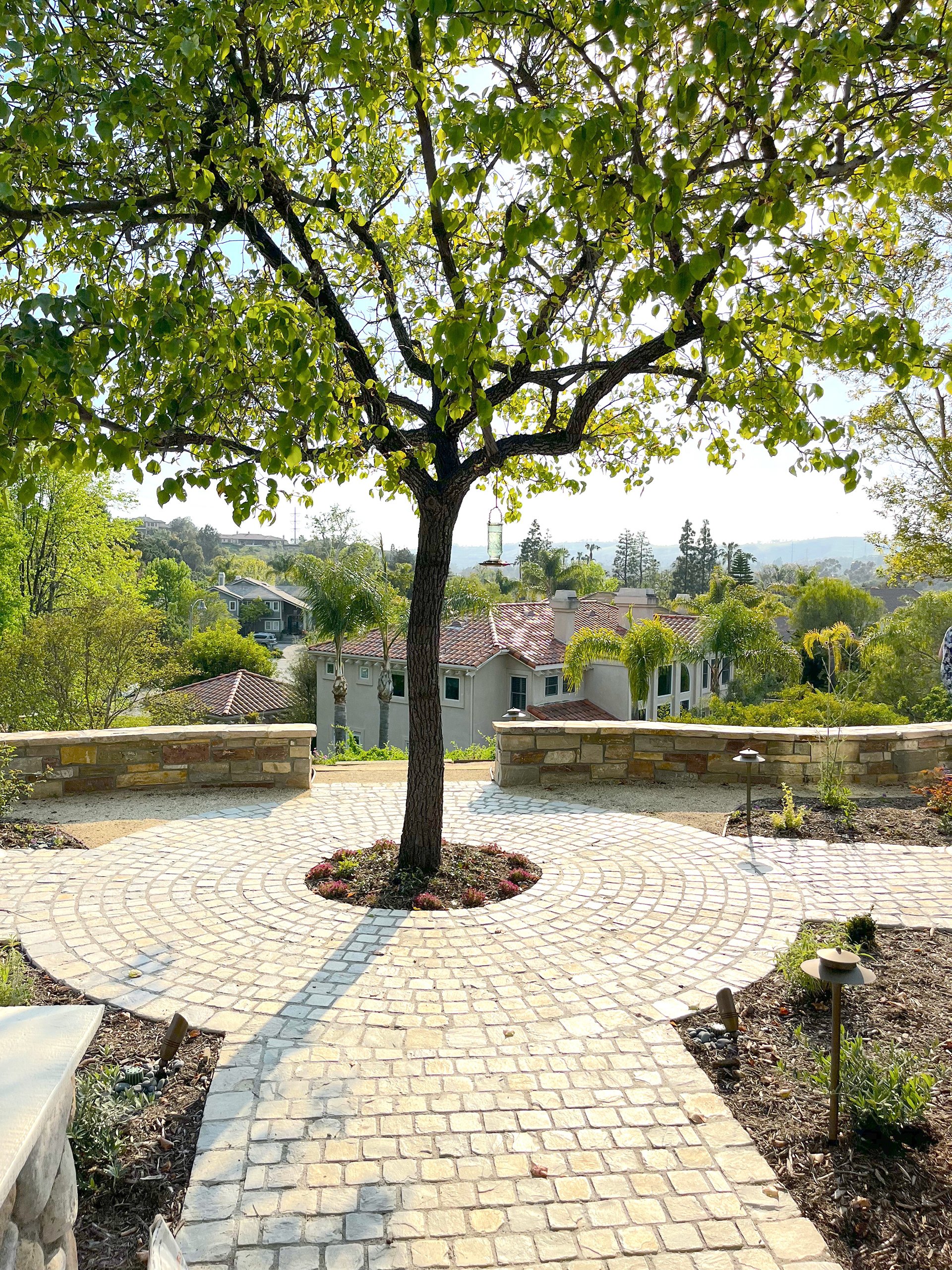 The terraced gardens transformed a sloped area into a series of layered tiered garden levels and seating areas. The upper stone cobble walkways through the cutting garden, lead to the outdoor entertaining and firepit area. The curved stone walls double as a seat wall and an unobtrusive low property barrier to the slope side. At the top of the slope landscape, timbered steps leading to the soft DG pathways through a newly planted young orchard, lined with fruit trees that terrace the length of the property.