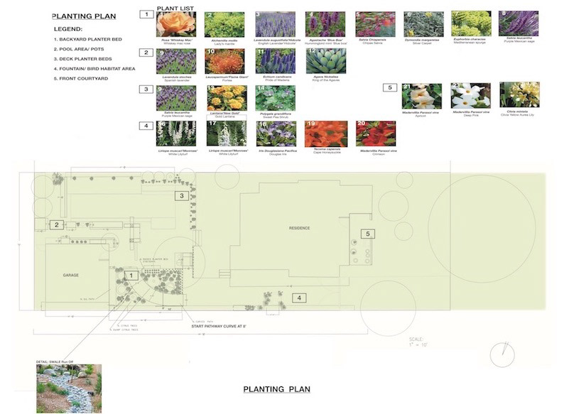 Renovation of a Spanish courtyard lap pool lot in Santa Monica included adding new brick pathways to allow for easier access to new garden areas surrounding the pool. A small area was carved out of the existing pathways to create a cook's potage garden, filled with kitchen herbs, sages, lavenders and scented roses. The newly laid brick pathway bordered a small bosque of lemon trees. Agaves and grasses lined a drainage swale made from Mexican black rock. The high point of the project was incorporating a bird habitat area for the owners who are active bird watching enthusiasts. A large granite bowled disappearing fountain attracts birds and provides a visual focal point from the kitchen windows. Surrounding vegetation was chosen to increase pollinators and complement the bird habitat.