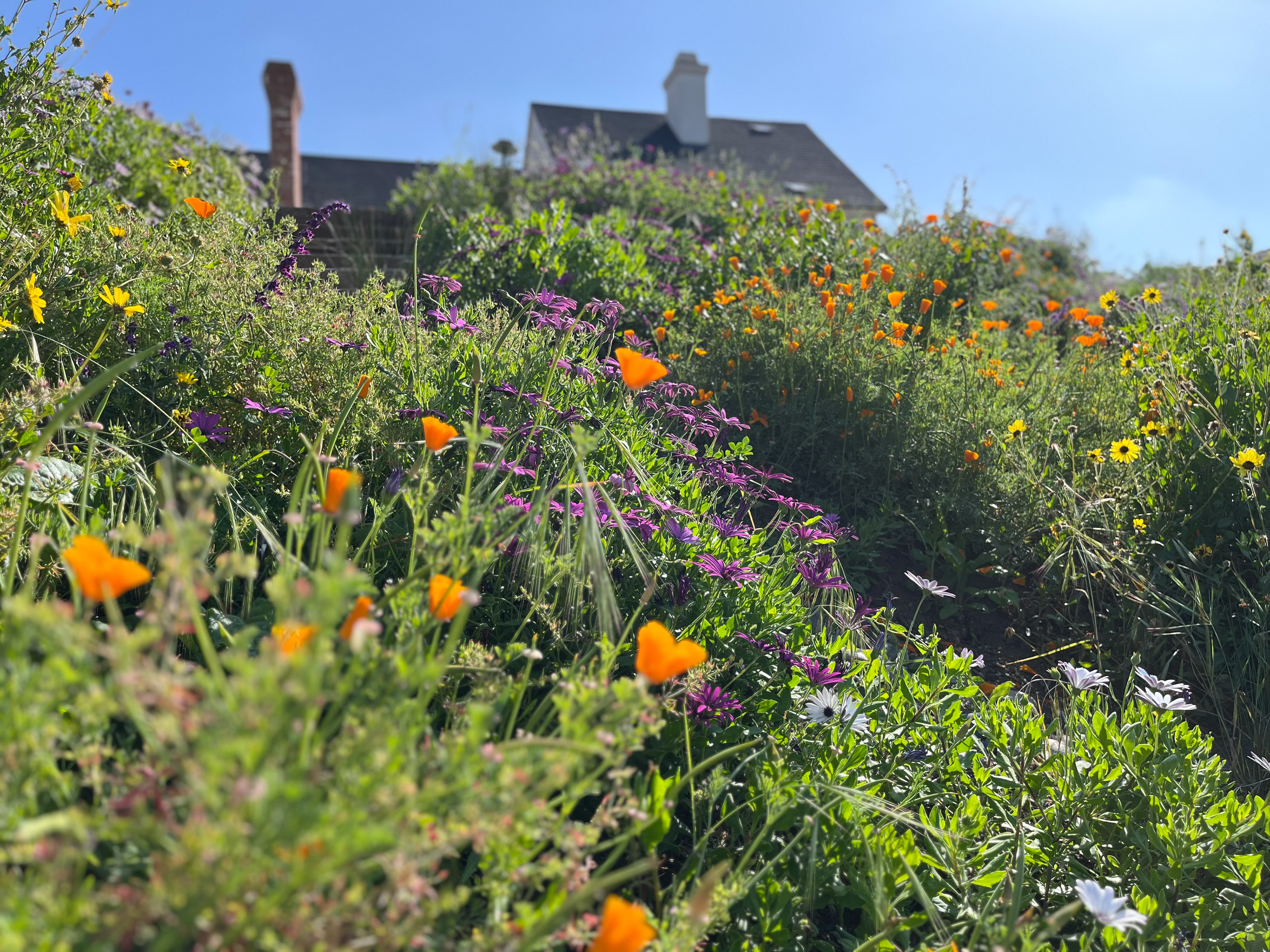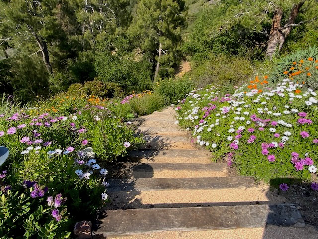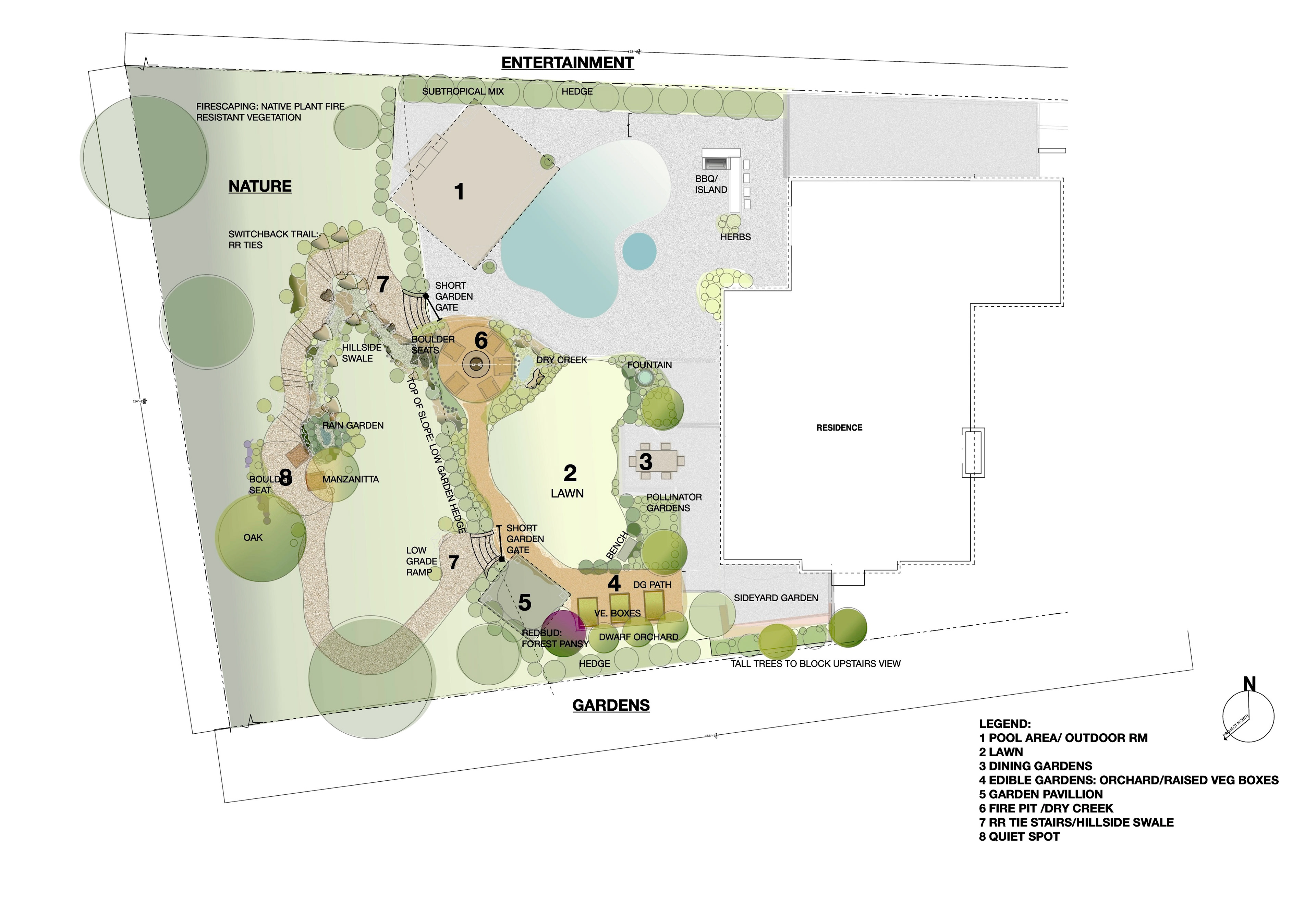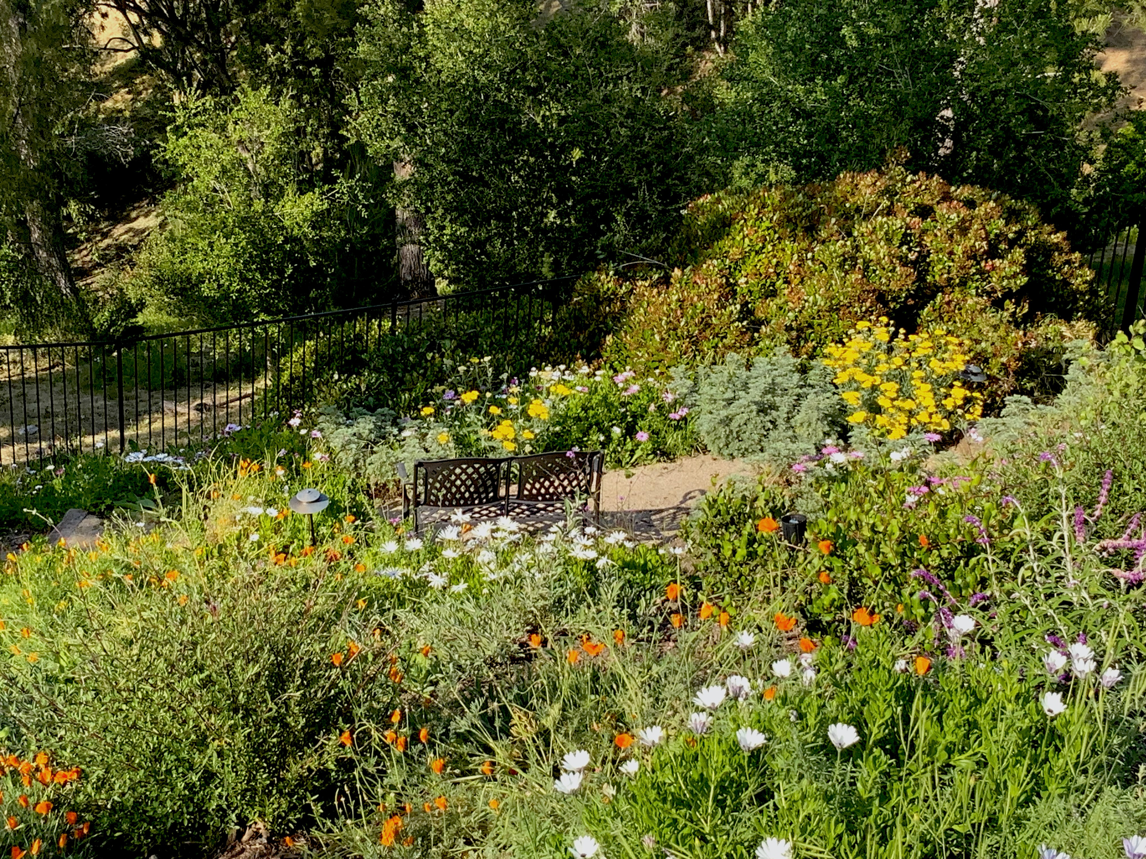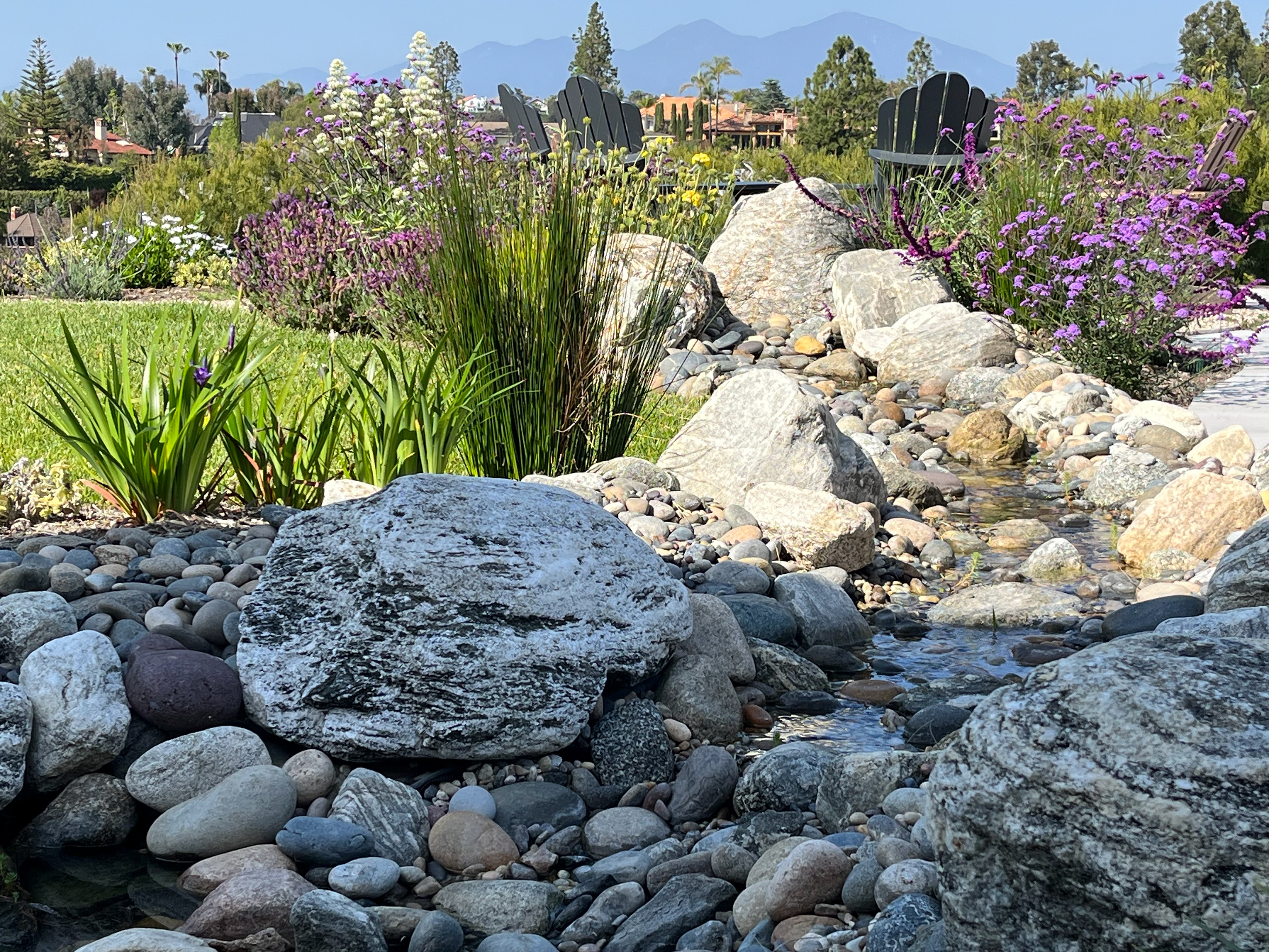 The large acre lot was bare dirt from years of neglect. The new owners requested to match their new outdoor environment to their camping family lifestyle, reminiscent of a Sierra backpacking trip. A Boulder Creek stream was added through the backyard from house to the outdoor firepit view spot at the top of the slope. A dry creek swale continued down the slope to catch the stormwater runoff. Oak trees and Native plants were added to hold down the top of the slope as wildflower seeds were spread for spring bloom. A circular DG pathway with railroad tie steps led down the slope, to the quiet spot bench for late afternoon guitar playing while watching the view over the hills.
